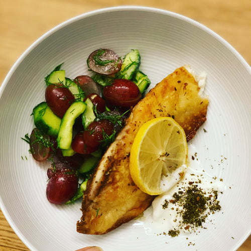 Oven Roasted Tilapia with Cucumber, Mint, Dill, and Grape Salad and Yogurt Garlic Sauce
