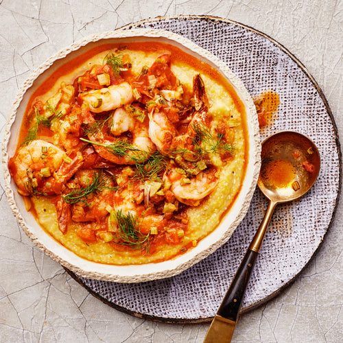 Portuguese **Shrimp with Polenta and braised Broccoli Rabe and Kale (no g-f or d-f option for this dish)