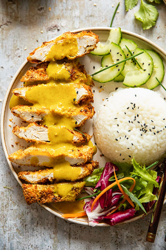 Japanese Katsu Curry with Steamed Rice and Pickled Cucumbers