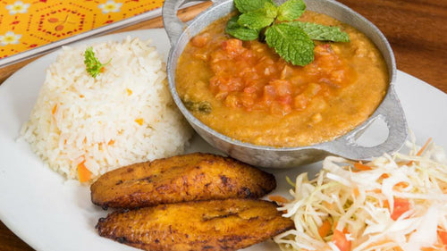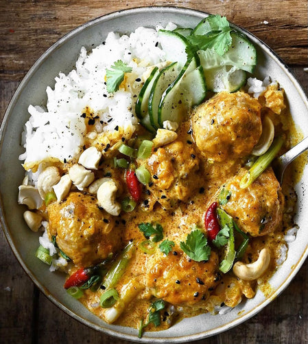 Jamaican Chicken Meatball Curry, served with Cucumber, Cashew, Cilantro, Nigella seed salad and Steamed Rice